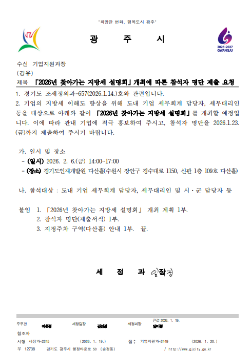 2026년 찾아가는 지방세 설명회 개최에 따라 참석하실 기업이 있으시면 명단을 1.23.(금)까지 제출하여주시기바랍니다.