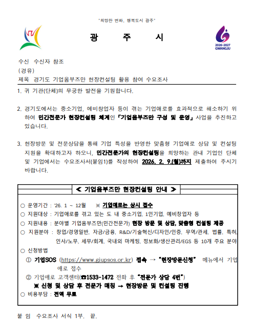 경기도 기업옴부즈만 현장컨설팅 활용 참여 수요조사를 하오니 희망하는 기업인 단체 및 기업이 있으시면 2.9.(월)까지 수요조사서를 제출하여 주시기 바랍니다.